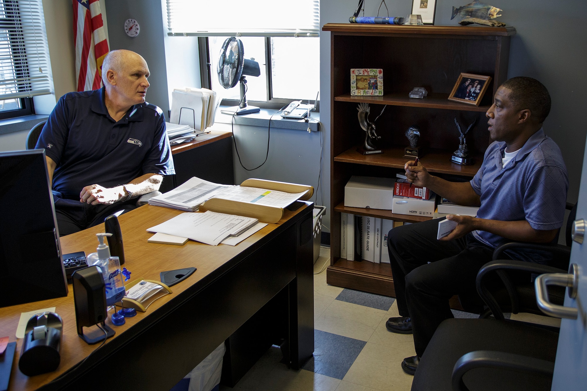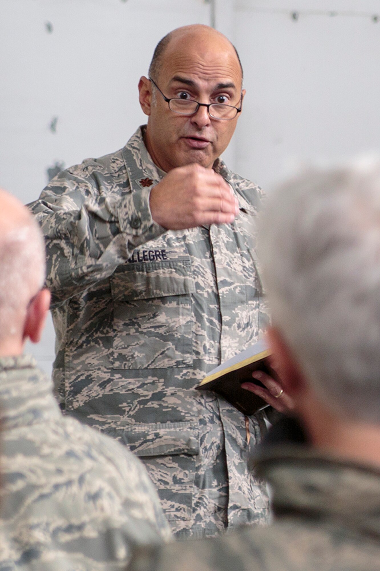 Chaplain (Maj.) Pierre Allegre, the 446th Airlift Wing chaplain, shares a prayer with a member of his civilian congregation who suffered an injury in her home, Oct. 30. Allegre is a pastor for a church in Lacey, Wash., and he said he's blessed to lead a congregation, which supports him in his capacity as an Air Force Reserve chaplain. (U.S. Air Force Reserve photo by Master Sgt. Jake Chappelle)
